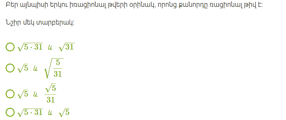 Рубрика: 12 Հանրահաշիվ և մաթեմատիկական անալիզի տարրեր 2. ԻՌԱՑԻՈՆԱԼ ՀԱՎԱՍԱՐՈՒՄՆԵՐ Опубликовано 22.09.2020 автором Թաթուլ
