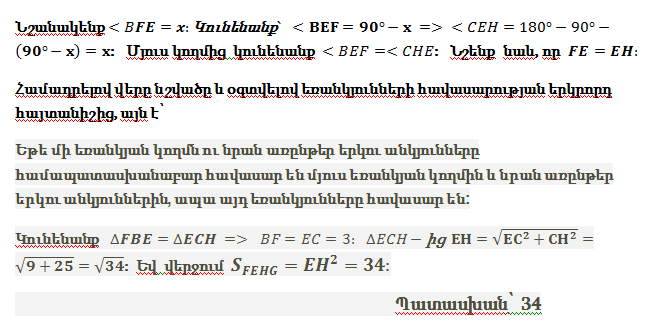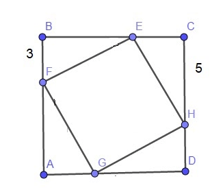 10. Փոքր քառակուսու գագաթները գտնվում են մեծ քառակուսու կողմերի վրա: Գտեք փոքր քառակուսու մակերեսը, եթե CH= 5, BF=3: